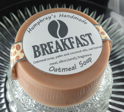 BREAKFAST soap is our oatmeal blend with the scent of coffee beans. This lovely oatmeal soap also has silica (sand) and oat kernel meal for gentle and natural exfoliation. Great to scrub your hands and body like a mechanics or gardeners soap. Great unisex soap. Our male and female customers love it!