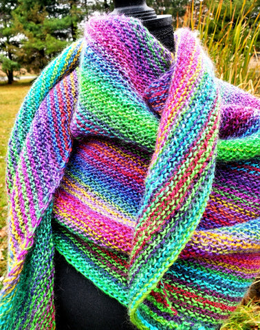 ♦ This shawl is in color "Lucky Charm". Hues of purple, pink, yellow, blue and green alternate and flow between each row.