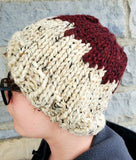 This traditional fair isle patterned hat is hand knitted in a bulky wool blend. It's primary colors are burgundy and beige. Very unisex.