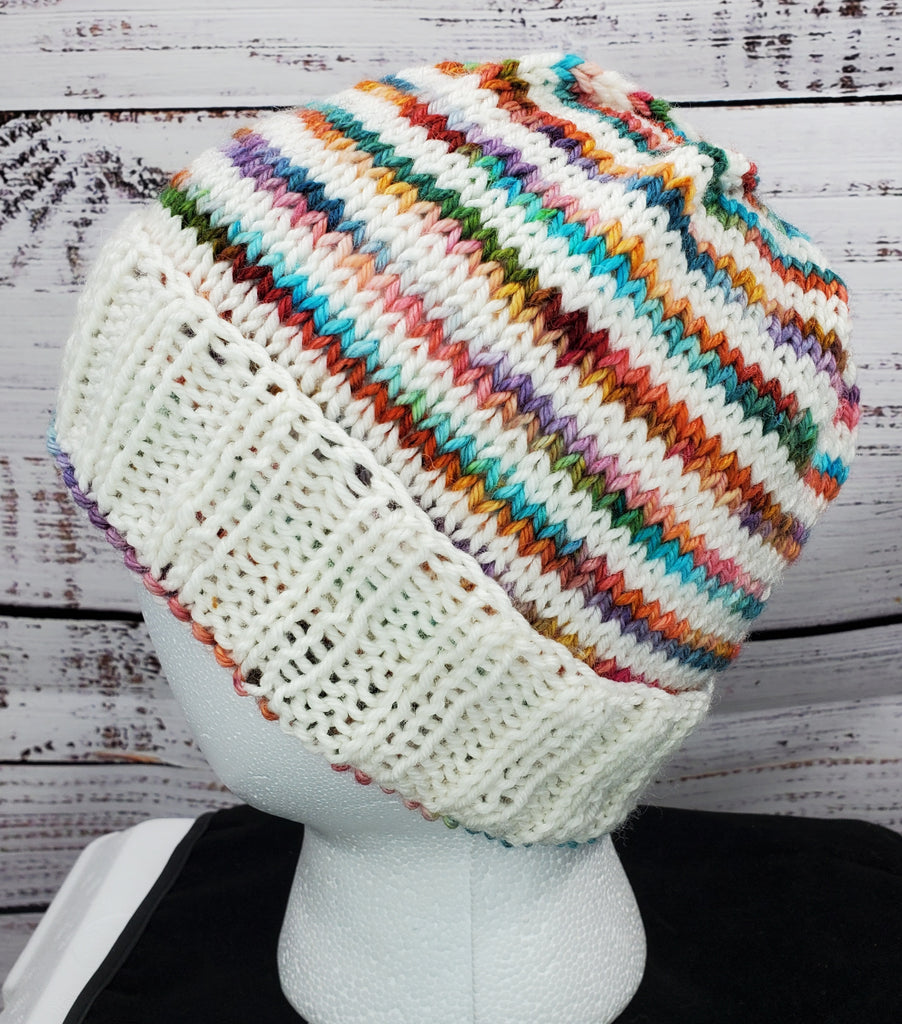 Design: Traditional stockinette stitch where I rotated the white and rainbow merino every two rows.
