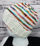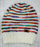 This striped rainbow 100% merino wool hat is soft, thick, warm, and unique! This traditional hat is hand knitted in a stretchy stitch so that it can accommodate most head sizes, or women that like to tuck hair into their hat.