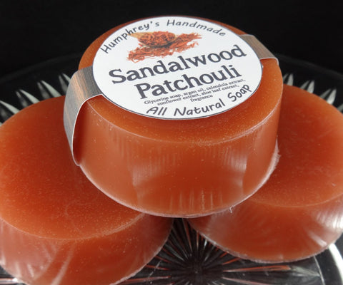 SANDALWOOD PATCHOULI is a delightful soap. The scent can be described as fragrant grains of sandalwood polished with the sweetness of balsamic richness. Enchanting notes of deep patchouli lie in the heart of the scent. Great scent, can be unisex although we list this with our other masculine soaps. We also sell a pure patchouli bar if you prefer to leave out the sandalwood notes.